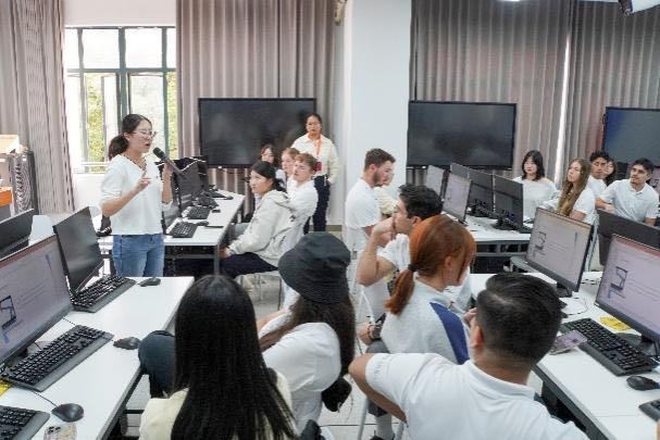 在浙经贸校园内,美国师生们参观了学校数字工匠学院,并在中国教师指导下,完成了电商直播理实结合的课程学习。